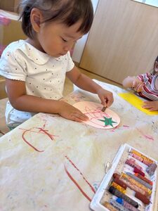 筆圧も強くなり、「ぐりぐり〜」「ぐるぐる〜」とお絵描きできました🖍️