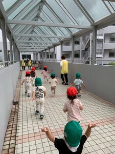 霧雨が降っていたので、パークタウンの屋根付き渡り廊下にお邪魔して少しだけ発散😆 よ〜いドン!転んでも元気いっぱい✌️すぐに立ち上がってにこにこでした😊