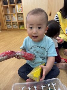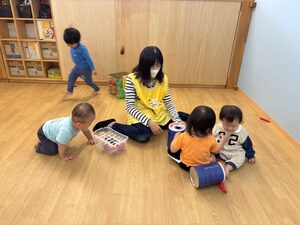 棚玩具で指先遊びを先生とじっくり楽しみました^_^最初は玩具な穴の中にはいらず苦戦していた子も何回かやっていくうちに上手になっていきました😍