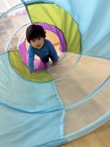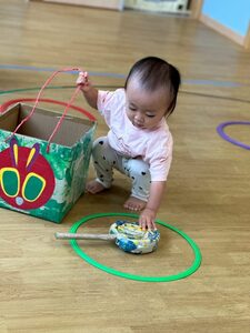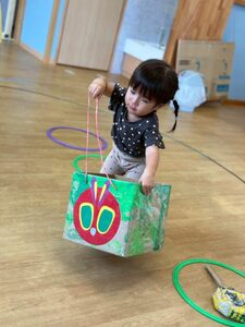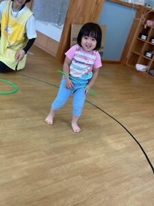 フープくぐりでは、自分でフープを持って頭からくぐります^_^ぱんだぐみさんは「よいっしょ、よいしょ」と身体をねじりながらくぐっていました🩷