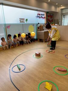 あおむしさんのオヤツを拾ってゴール!!待っているお友達は座って「がんばれ〜!」と応援📣してくれました^_^