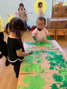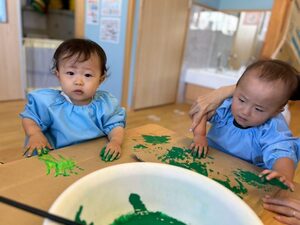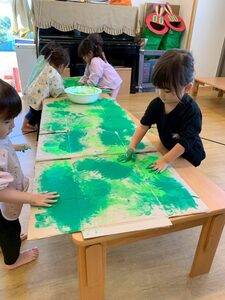 こあら組さんも絵の具ぺたぺた!冷たくて気持ちいいよー!テーブルの上までダイナミックに塗っていました😁