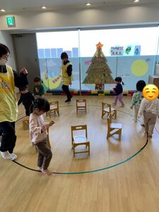 トトロの「さんぽ」の曲に合わせてみんなで歩いてまわりましたよ♫曲がとまったら、急いで椅子を探して座れるかな〜