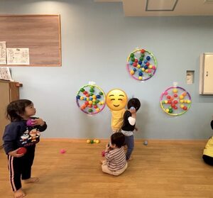 ボールを投げたり、転がしたり、剥がしたりする動作を繰り返すことで、脚や腕の筋肉などのさまざまな動きを身につけていきます。