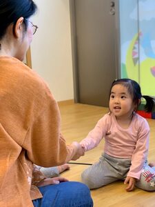 その後は、お名前を呼んでもらいリズムに合わせて「こんにちは!はーい」とお返事をしますよ〜💕最初の頃は緊張していた子も今では元気に「はーい!」と言えるようになってきました!