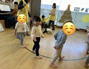 クリスマスにちなんで…ピアノに合わせて鈴を鳴らしたりクリスマスツリーポーズをしたりして身体をたくさん動かしました♡