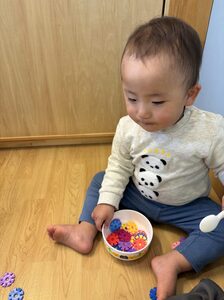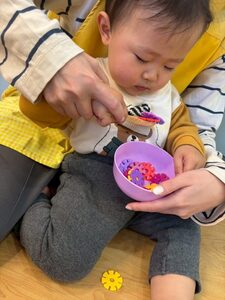 すくうのが難しく苦戦中ですが、ゲーム感覚ですくう練習をしたり保育者が手を添えて手首の使い方を身につけたり、、、今は練習中です🥰
