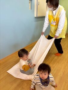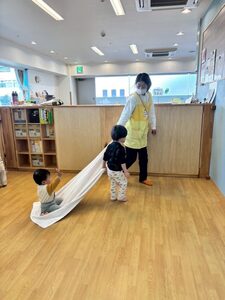 小さい子チームは、シューっと動くタオルマットの上にバランスを取りながら座って移動♩