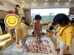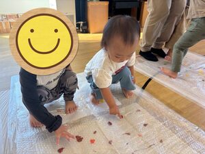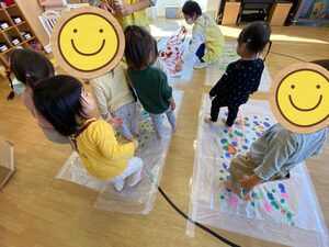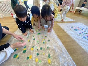絵の具あそびをしました🎨紙の上に絵の具を垂らし、プチプチを重ねて、その上をふみふみしたり、手で伸ばしてみたり、絵の具が広がる様子を見て楽しみました😊