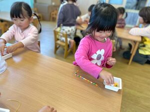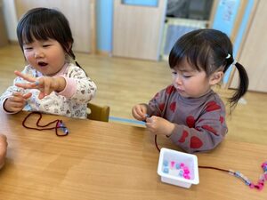 ぱんだ組・うさぎ組さんは、紐通しに挑戦!指先の発達段階に合わせてビーズや穴の大きなストロー、紐の長さを調整してちょっとだけチャレンジ!自分だけのネックレスやブレスレットが出来上がりました💕
