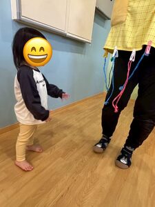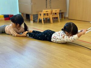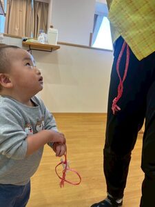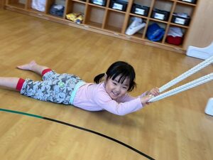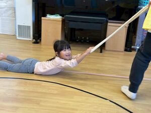その後は縄を使って遊びました!両手でギュッと掴んで先生に引っ張ってもらうよ💕まるでアンパンマンになった気分♩