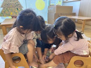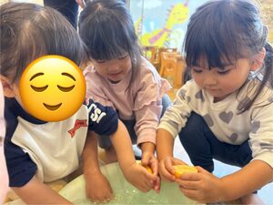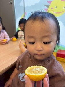 早速みんなは柚子を触ってみたり匂いを嗅いだりして「いいにおいがする!」「でこぼこしてるね」と感じたことを言葉にしながら、興味津々の子どもたち❤️