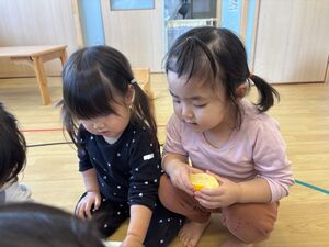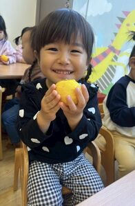 中にはそっと頬に近づけてみたり、両手で大事そうに持ったりする姿も見られ、季節の果物に親しみを持つことができました^_^