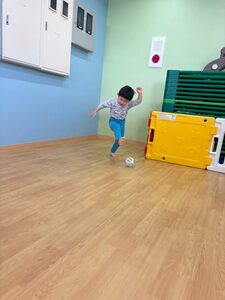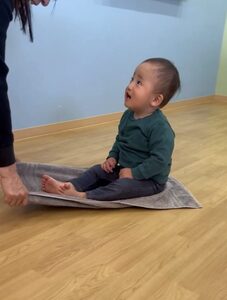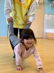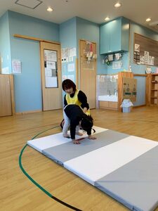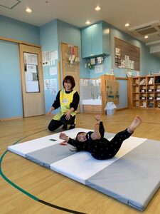 子どもたちが分かりやすいようにマットに印を貼り、手や足を印の上に置きます!先生が「お顔こっちだよ〜」の合図でゴローン👍🏻